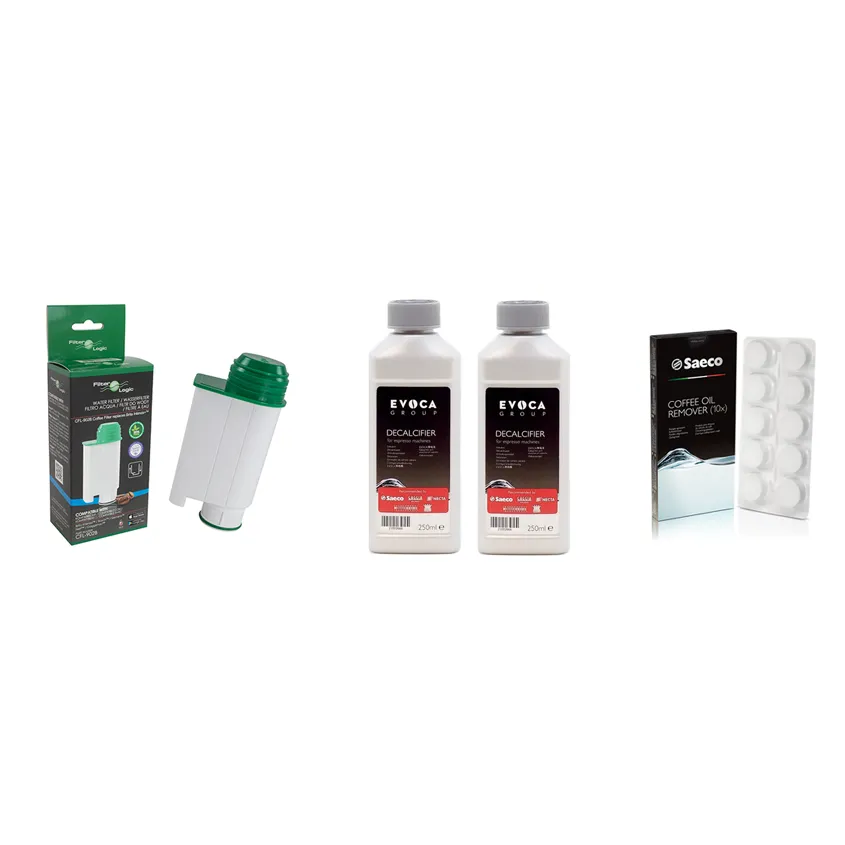 Súčasťou balenia sú 1 ks Filter Logic CFL-902B + 1 ks Saeco CA6700 odvápňovač 500 ml + 1 ks Saeco CA6704 / 99 čistiace tablety do sparovacej jednotky 10 ks (1,6 g).