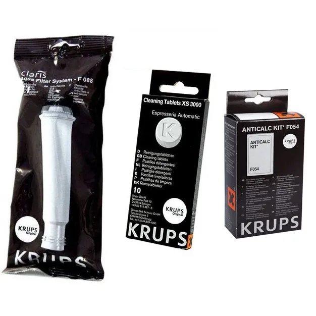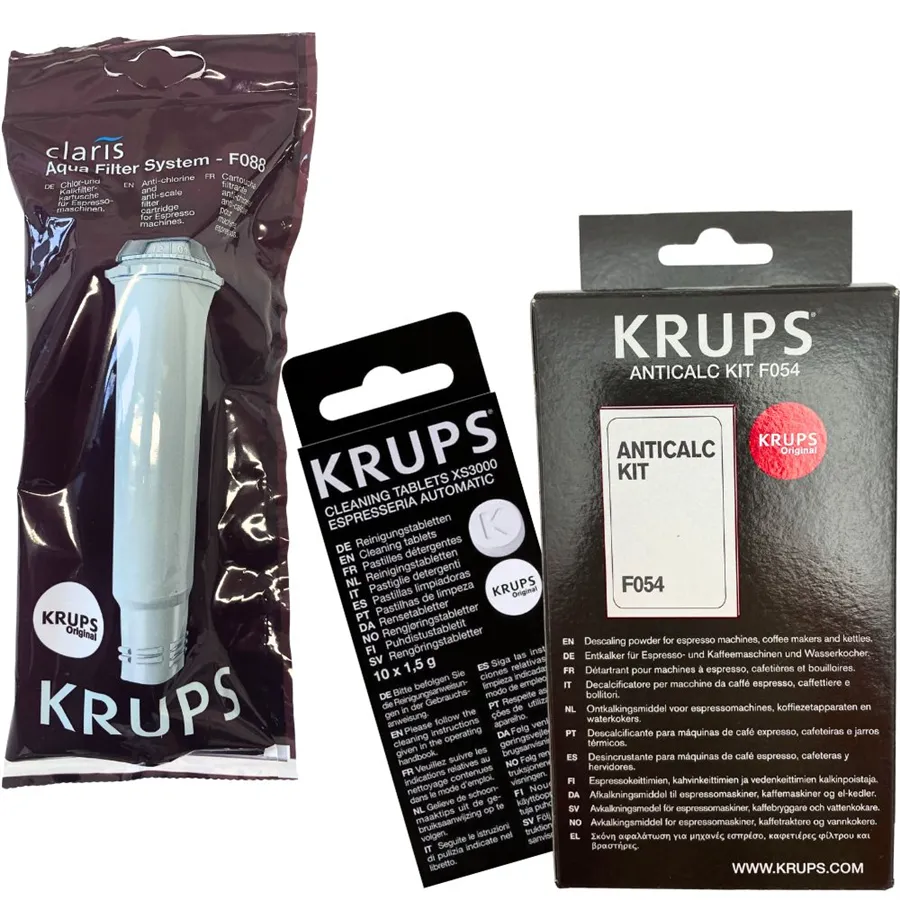 Súčasťou balenia sú 1 ks Krups F08801 Aqua Filter Claris + 1 ks Krups XS300010 čistiace tablety + 1 ks Krups F0540010 odvápňovač do kávovaru.
