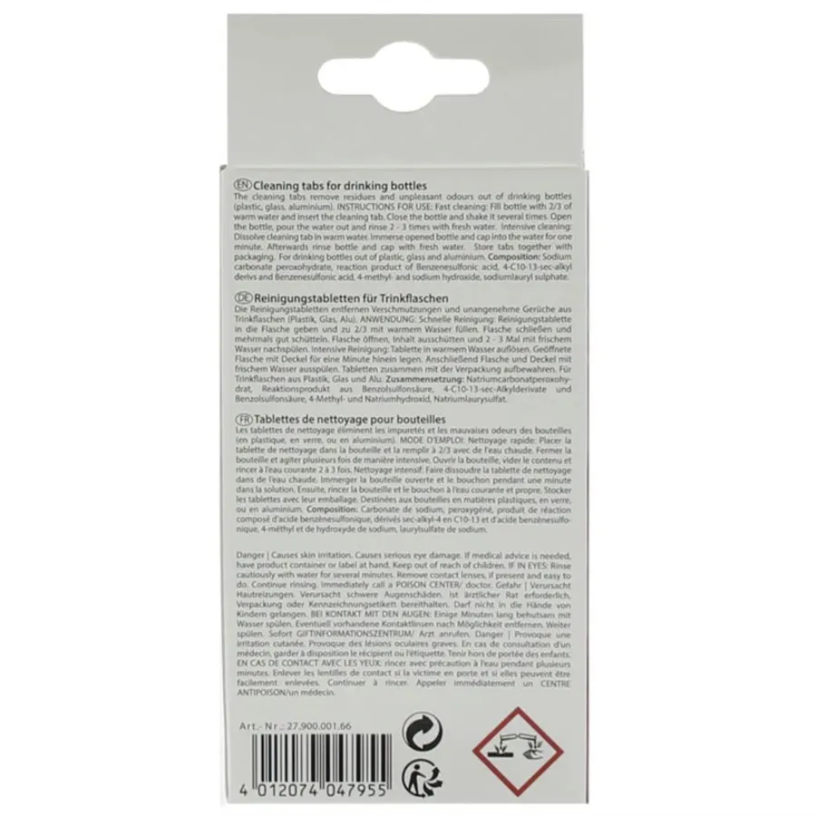 Návod na použitie: naplňte 2/3 fľaše teplou vodou, vložte tabletu, zatvorte, pretrasete, vylejte a opláchnite 2–3× čistou vodou.