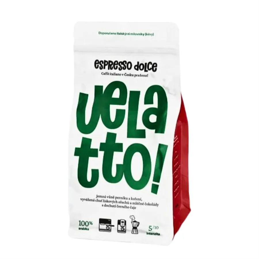 Velatto Espresso Dolce prináša harmóniu medzi mliečnou čokoládou a lieskovými orechmi s elegantnou dochuťou čierneho čaju. Na začiatku dominuje sladkosť mliečnej čokolády, zatiaľ čo intenzívna horkosť lieskových orechov dodáva káve telo a štruktúru. Jemná citrusová kyslosť pripomínajúca grapefruit dodáva káve príjemnú sviežosť. Táto zmes je obzvlášť vhodná na prípravu čistého espressa, kde je možné plne oceniť všetky jej tóny.